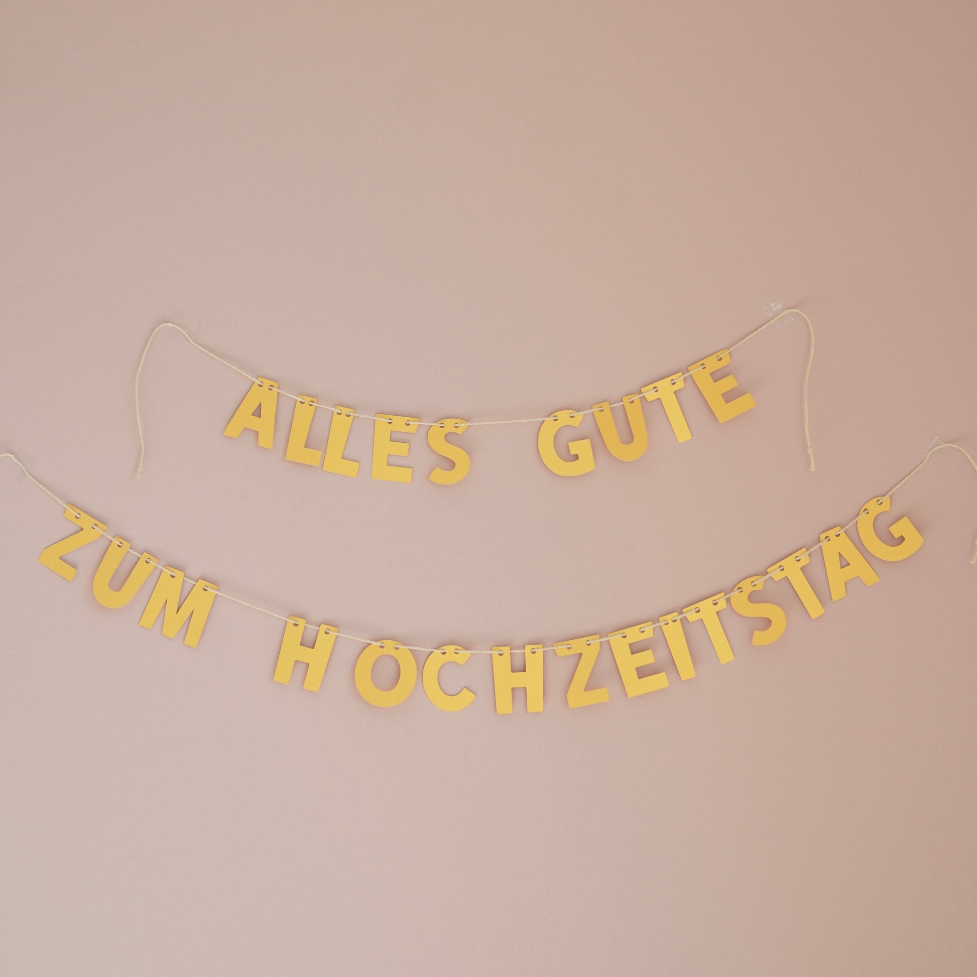 Zarte Papiergirlande in Gold mit der Aufschrift „Alles Gute zum Hochzeitstag“ auf zwei Baumwollkordeln – elegant schimmernd und perfekt für jede Raumgröße. Eine liebevolle Dekoration, die euren besonderen Tag festlich und warm wirken lässt.