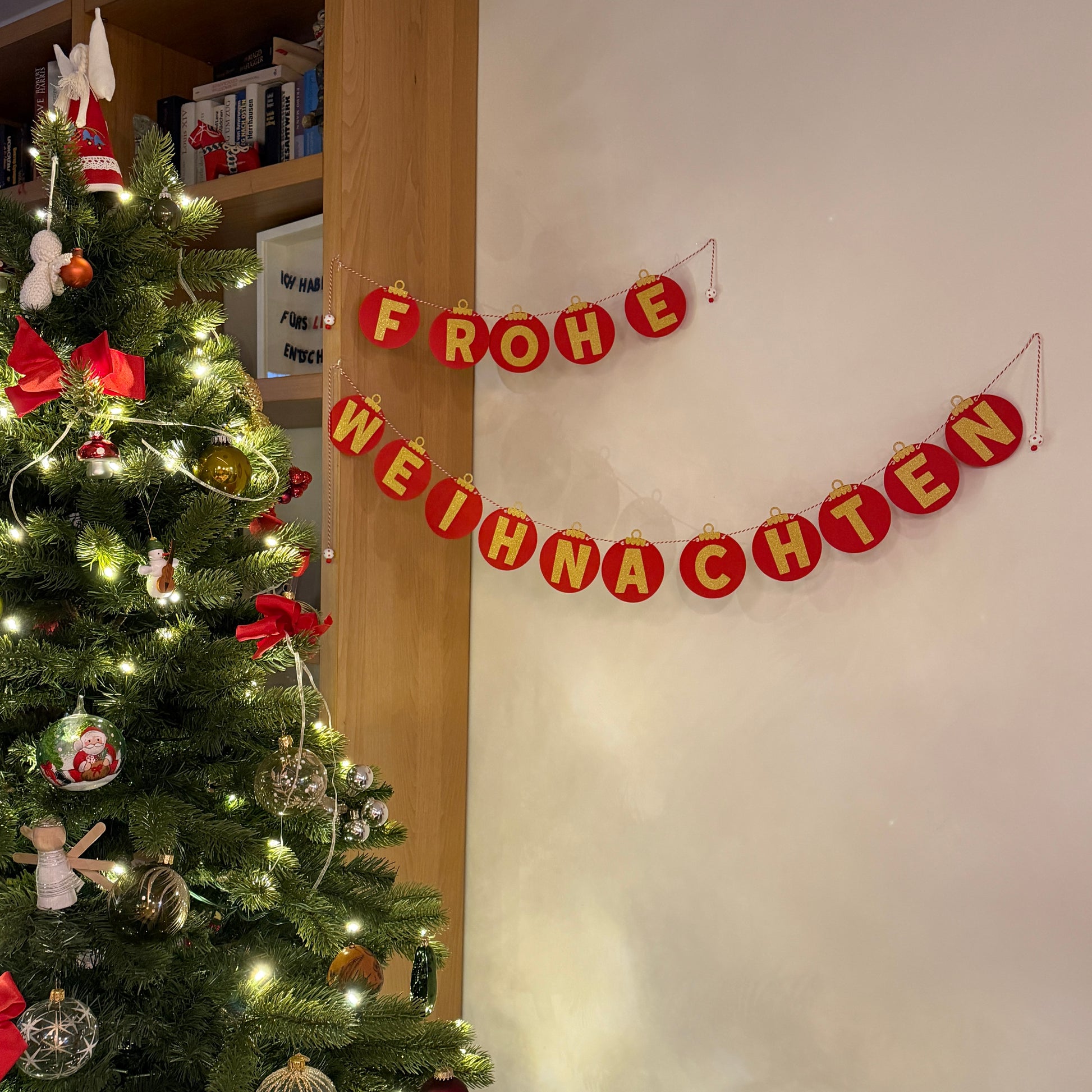 Handgemachte Papiergirlande „Frohe Weihnachten“ in Rot und Gold – leicht, festlich und sofort einsatzbereit. Perfekt für jede Weihnachtsdekoration und ideal als liebevolle Geschenkidee.