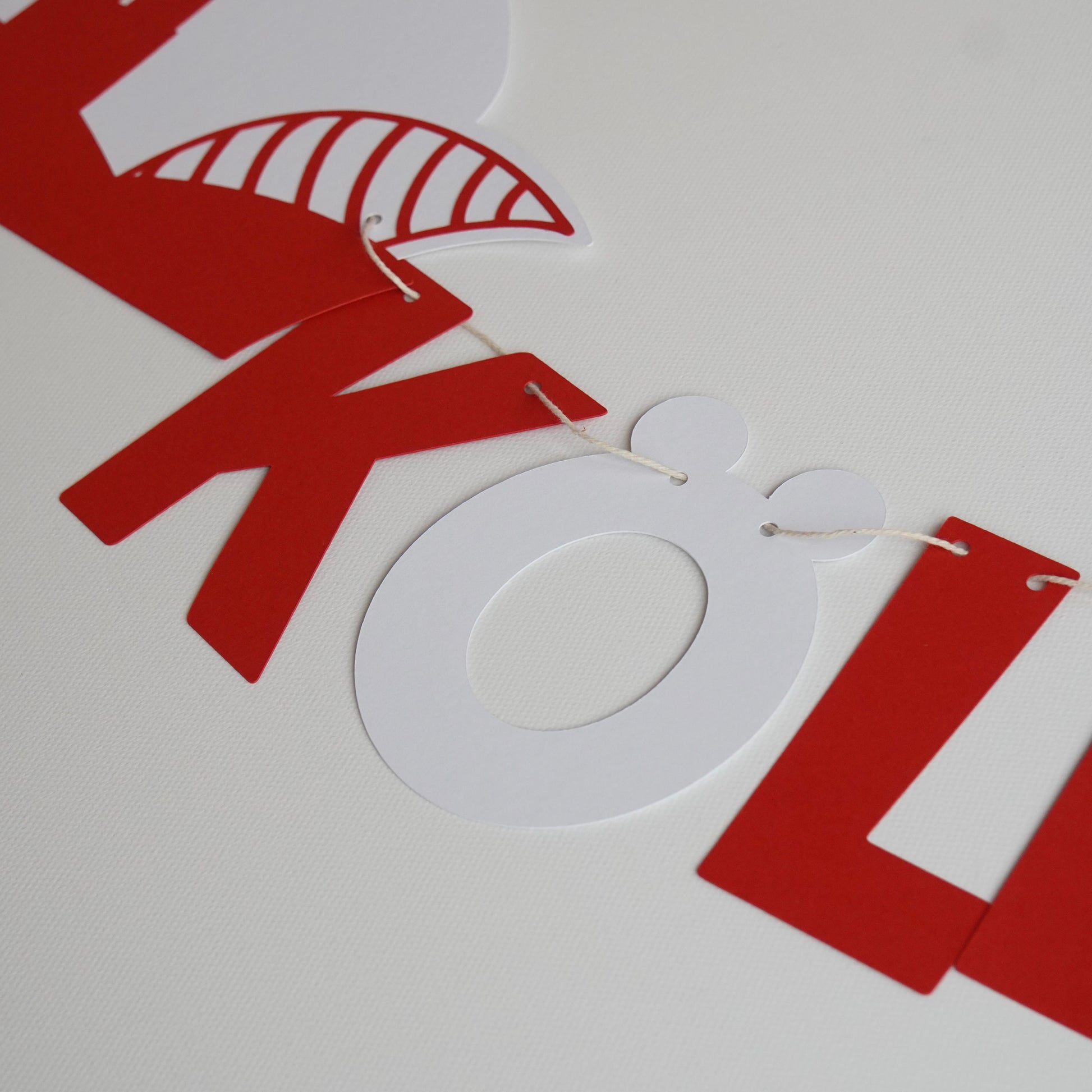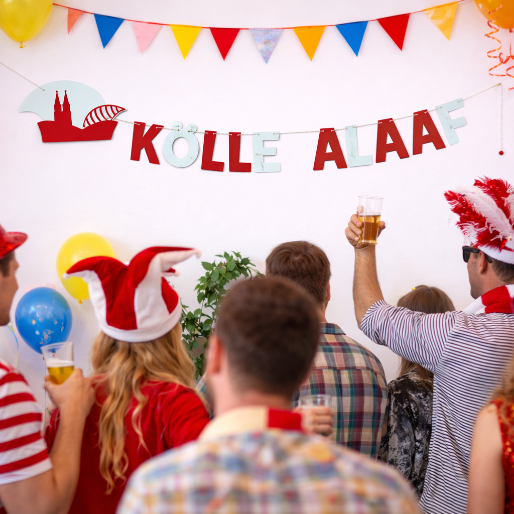 Mit dieser handgefertigten Girlande „Kölle Alaaf“ holst Du Dir echtes Karnevalsgefühl nach Hause, ins Büro oder in Deine Geschäftsräume. Die Girlande ist aus hochwertigem Papier in klassischem Rot und Weiß gefertigt und wird durch ein liebevolles Highlight ergänzt: eine Narrenkappe mit Kölner Dom – ein echtes Statement für alle kölschen Jecken.