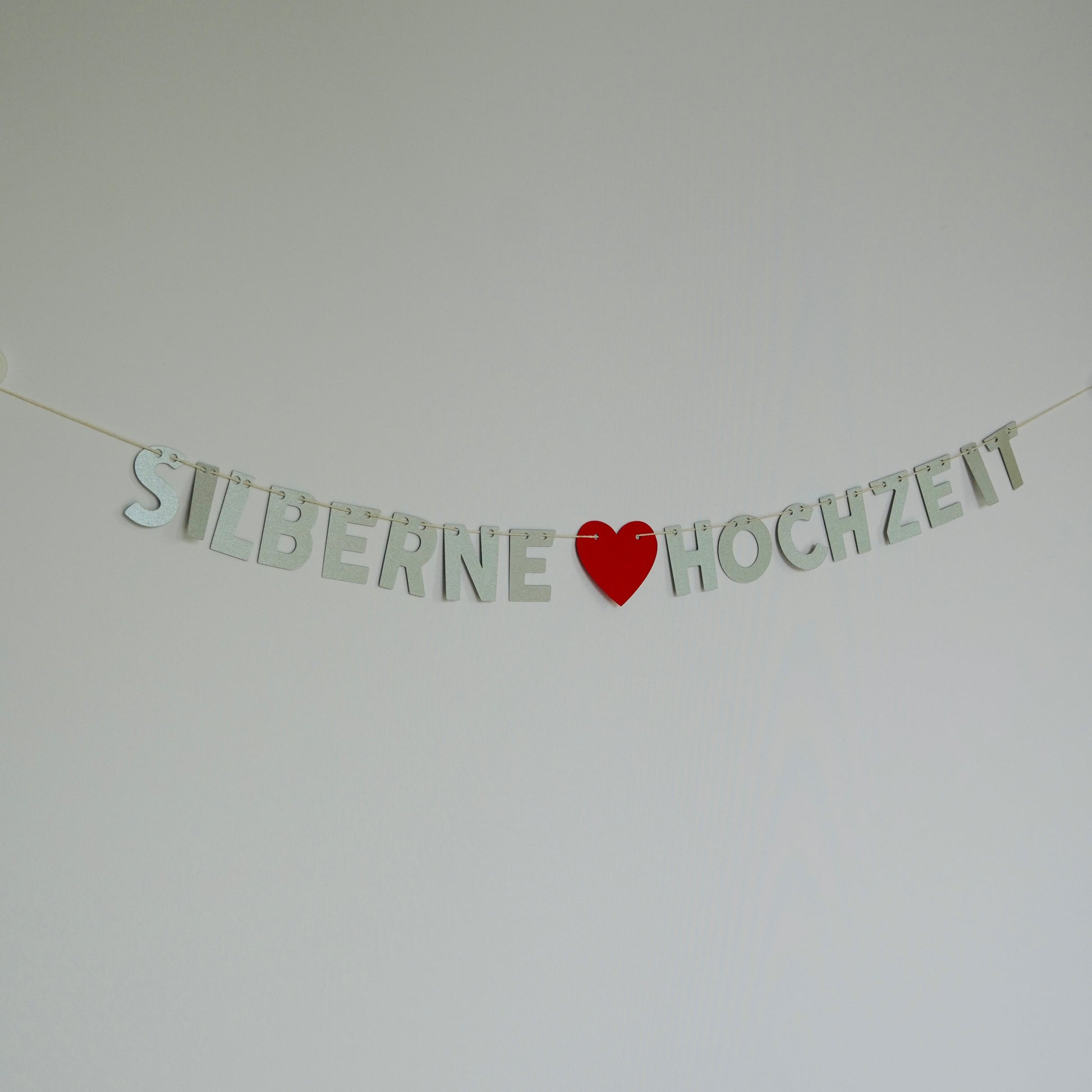 Feiere 25 Jahre Liebe mit einer stilvollen „Silberne Hochzeit“-Papiergirlande – handgefertigt aus stabilem Papier in edlem Silber mit rotem Herz-Highlight.