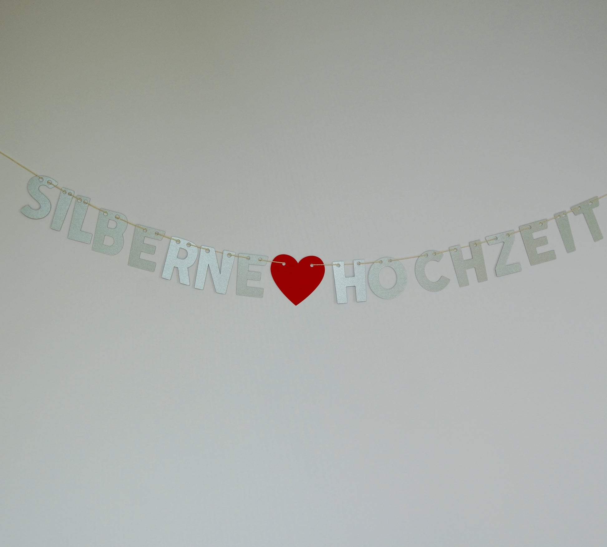 Feiere 25 Jahre Liebe und Zusammenhalt mit einer stilvollen Papiergirlande „Silberne Hochzeit“. Die Girlande wird von mir in liebevoller Handarbeit in meinem Atelier gefertigt – aus hochwertigem, stabilem 300 g Papier in edlem Silber, kombiniert mit einem roten Herz als Highlight.