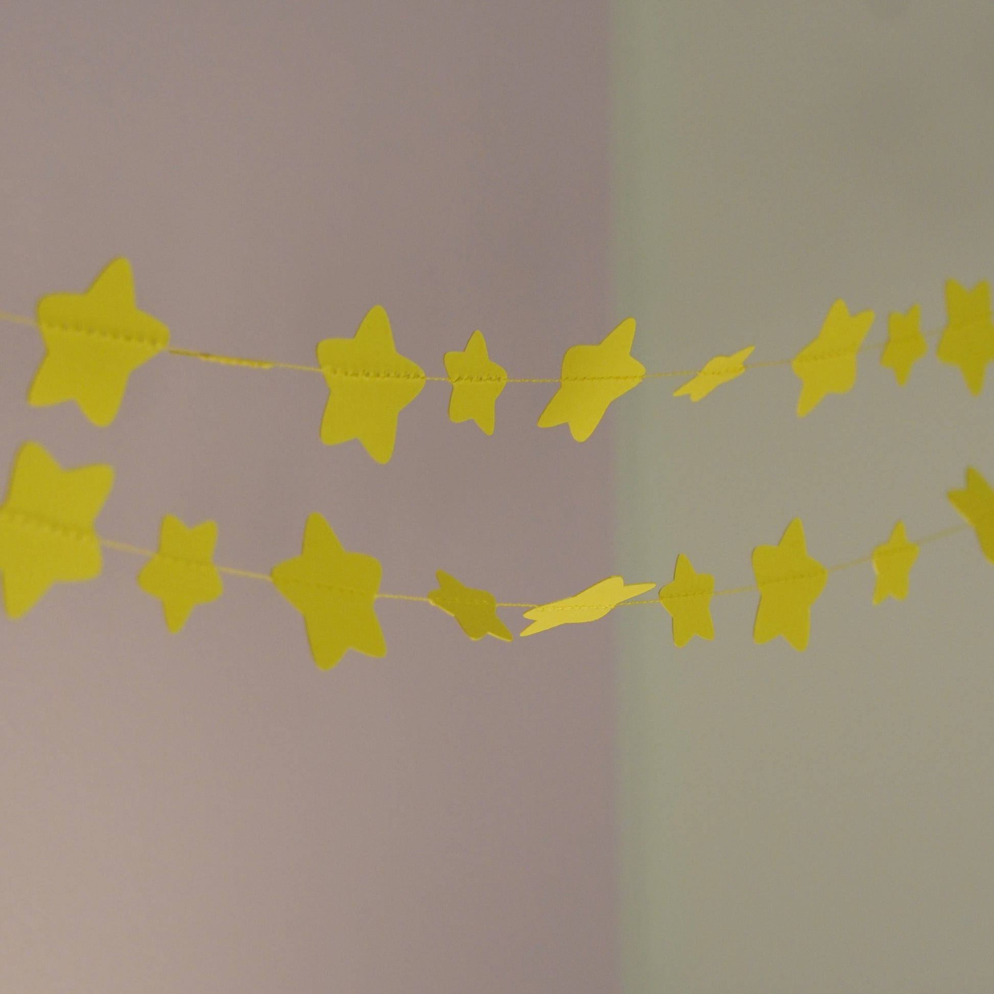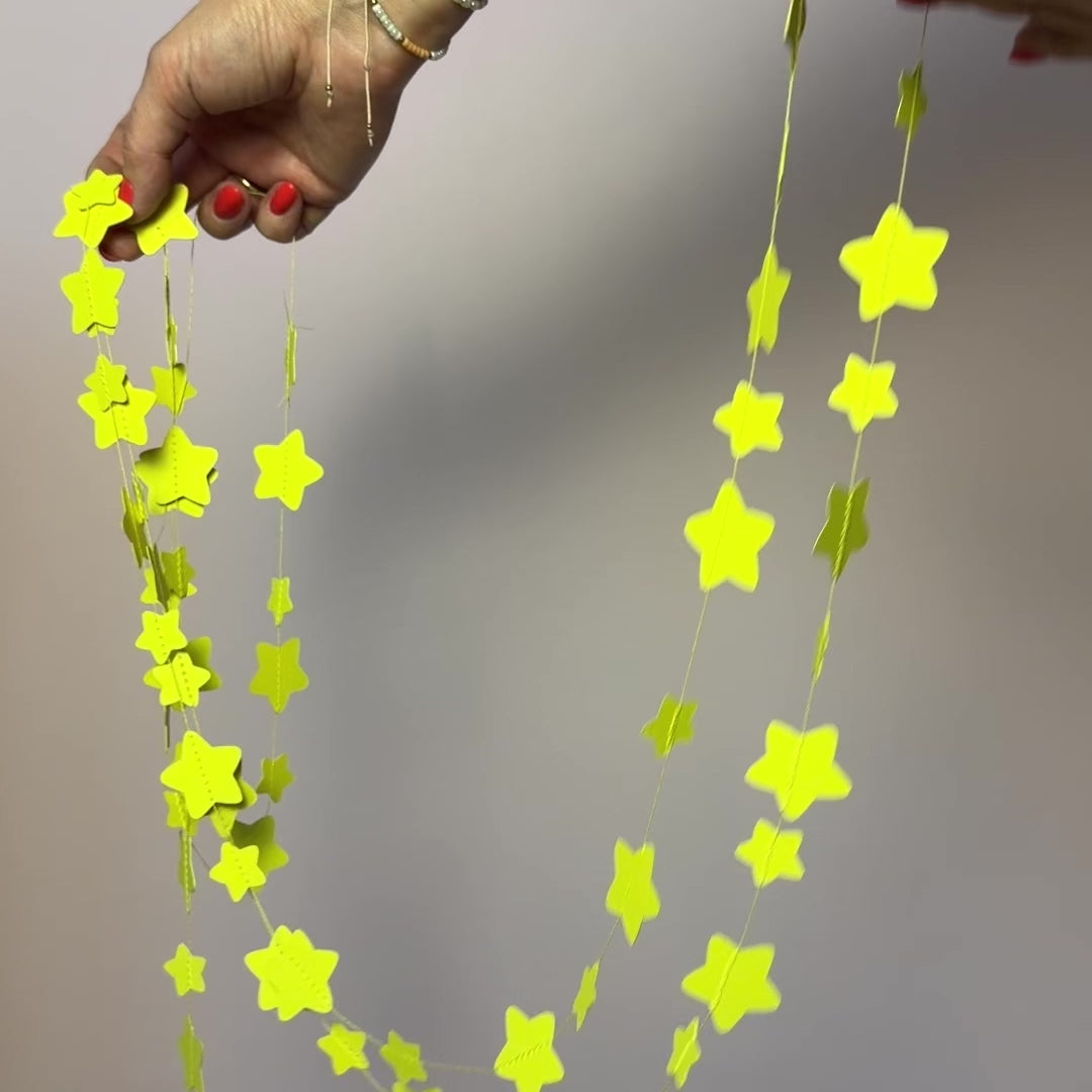 Leuchtend gelbe Sterne-Girlande aus hochwertigem Papier – perfekt für Kinderzimmer, Geburtstage und weihnachtliche Dekoration. In zwei Längen erhältlich und vielseitig einsetzbar.