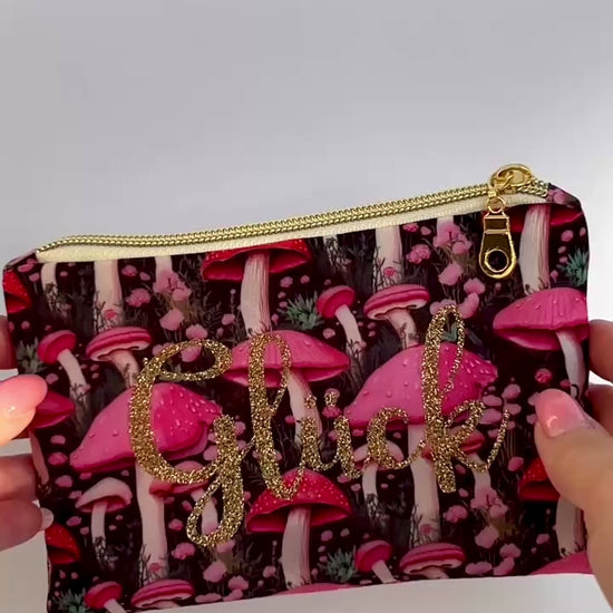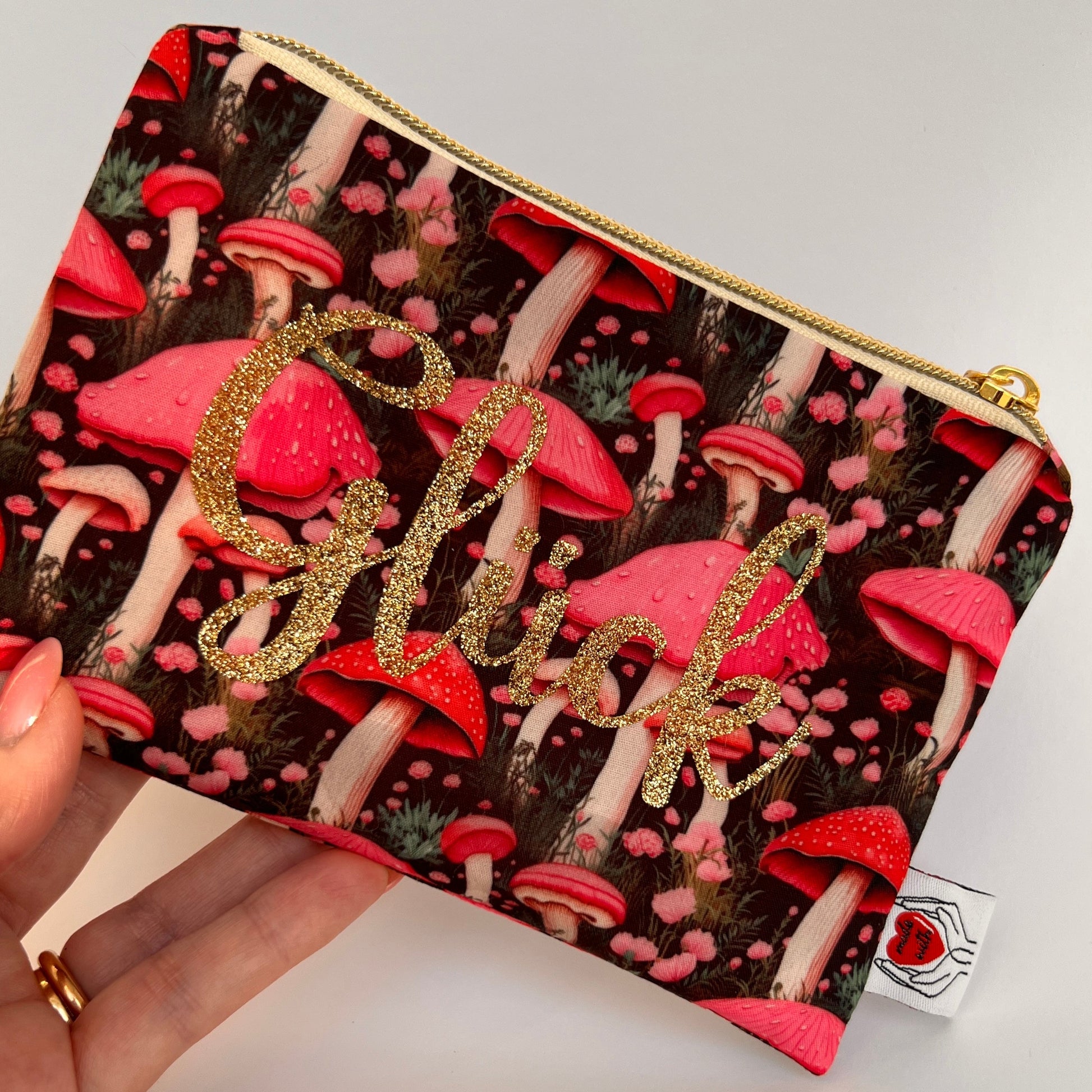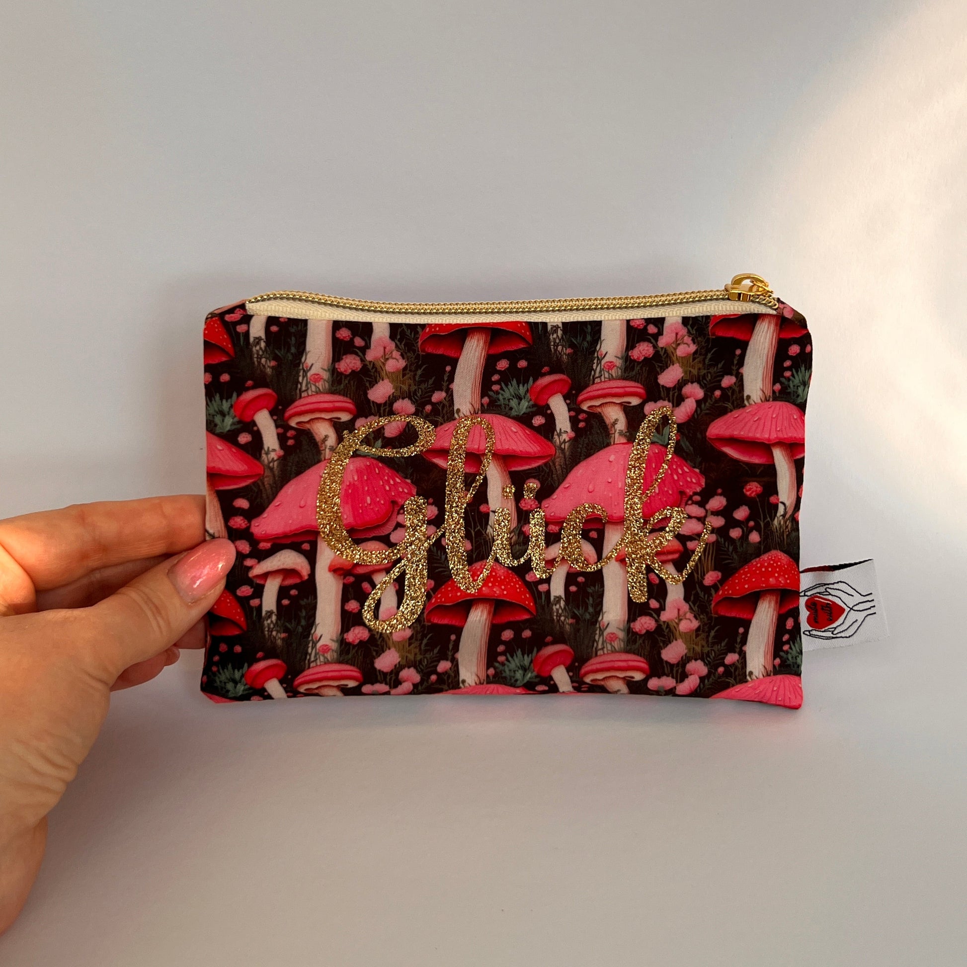 Diese handgefertigte Kosmetiktasche „Glück“ ist ein liebevolles Unikat – aus Baumwollstoff mit rosa Pilzen, goldenem Reißverschluss und schimmernder Aufschrift. Perfekt für kleine Alltagsdinge oder als stilvolles Geschenk für eine besondere Frau.