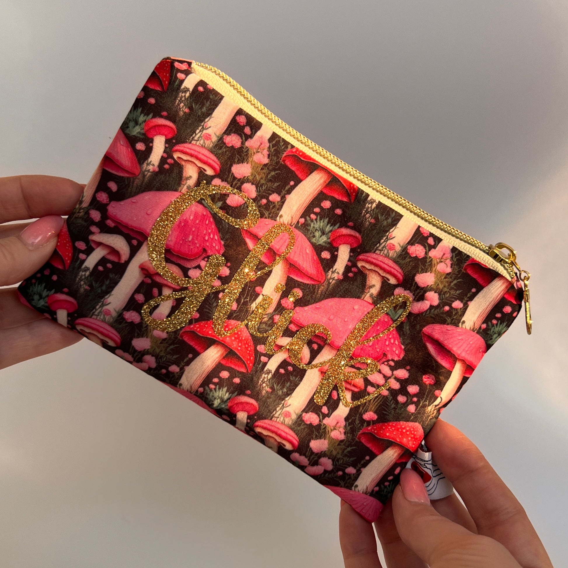 Ein echtes Unikat: Meine handgenähte Kosmetiktasche aus Baumwollstoff mit zartrosa Pilz-Muster und goldenem Reißverschluss bringt Stil und Glück in deinen Alltag ✨. Innen ist sie mit weißer Baumwolle gefüttert und mit der glitzernden Goldaufschrift „Glück“ veredelt – sie schimmert sogar bei sanftem Licht.