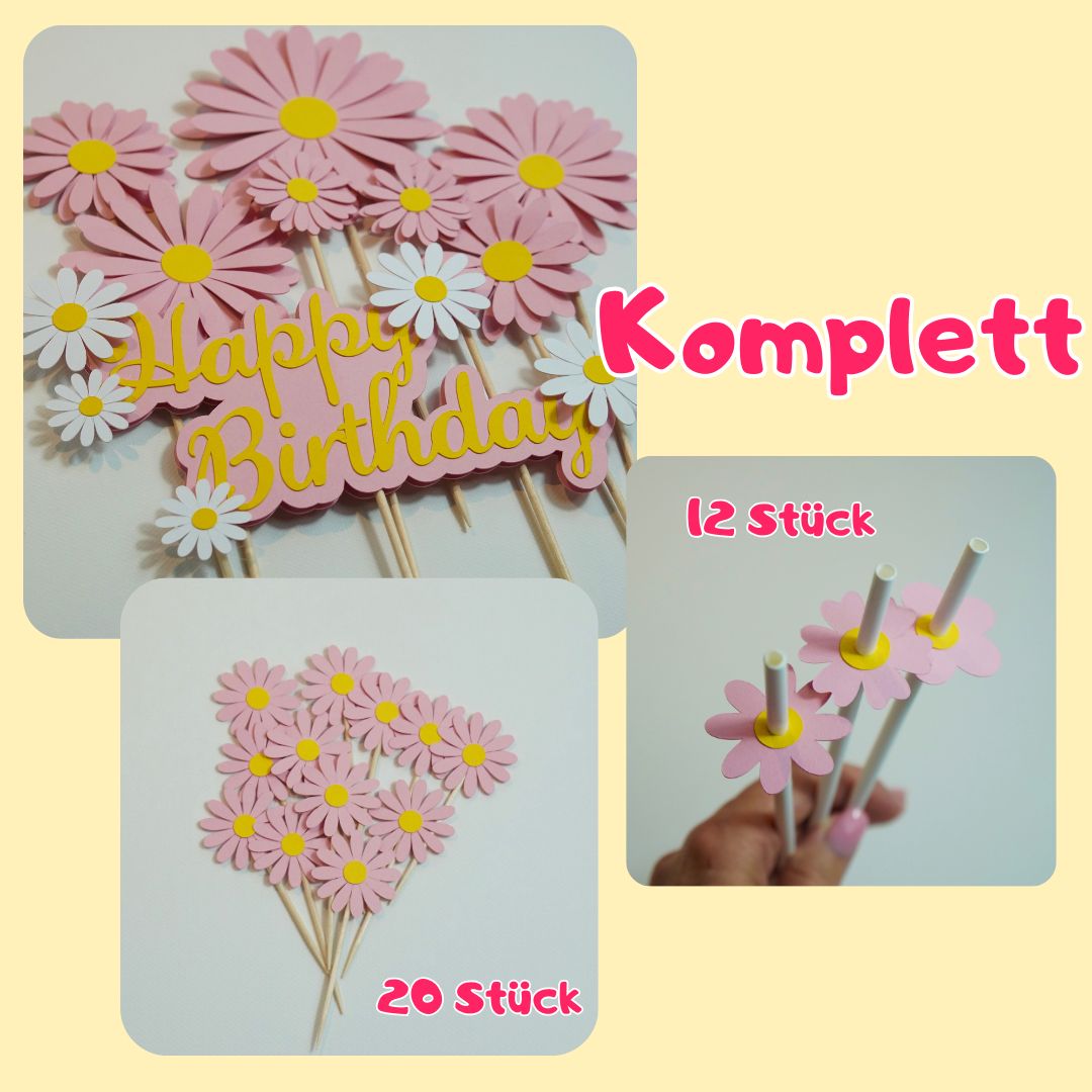Mach Deine Torte zum Blickfang mit meinem handgefertigten Blumen-Kuchen-Topper 🌸✨. Wähle aus drei liebevollen Sets – von zarten Blüten bis zum Komplettpaket mit Strohhalmen & Spießen – und bring Natürlichkeit auf Deinen Partytisch.