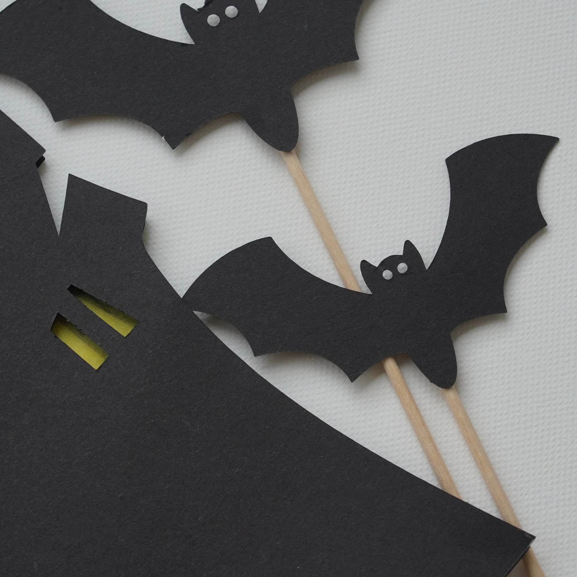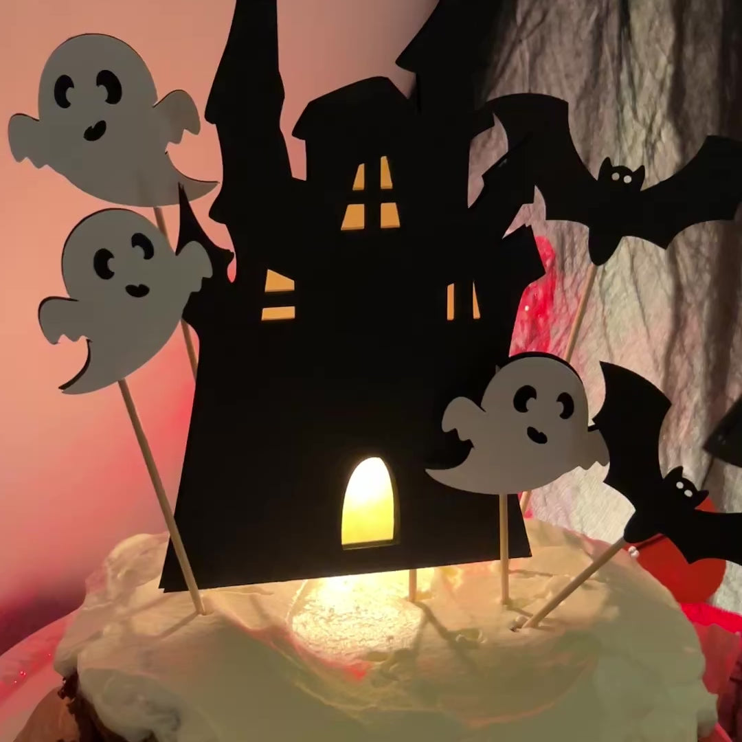 Zauberhafte Halloween-Kuchendekoration mit Gruselschloss, Geistern & Fledermäusen aus festem Papier. Wiederverwendbar, individuell anpassbar und ein echter Hingucker auf jedem Kuchen oder Buffet. 🎃