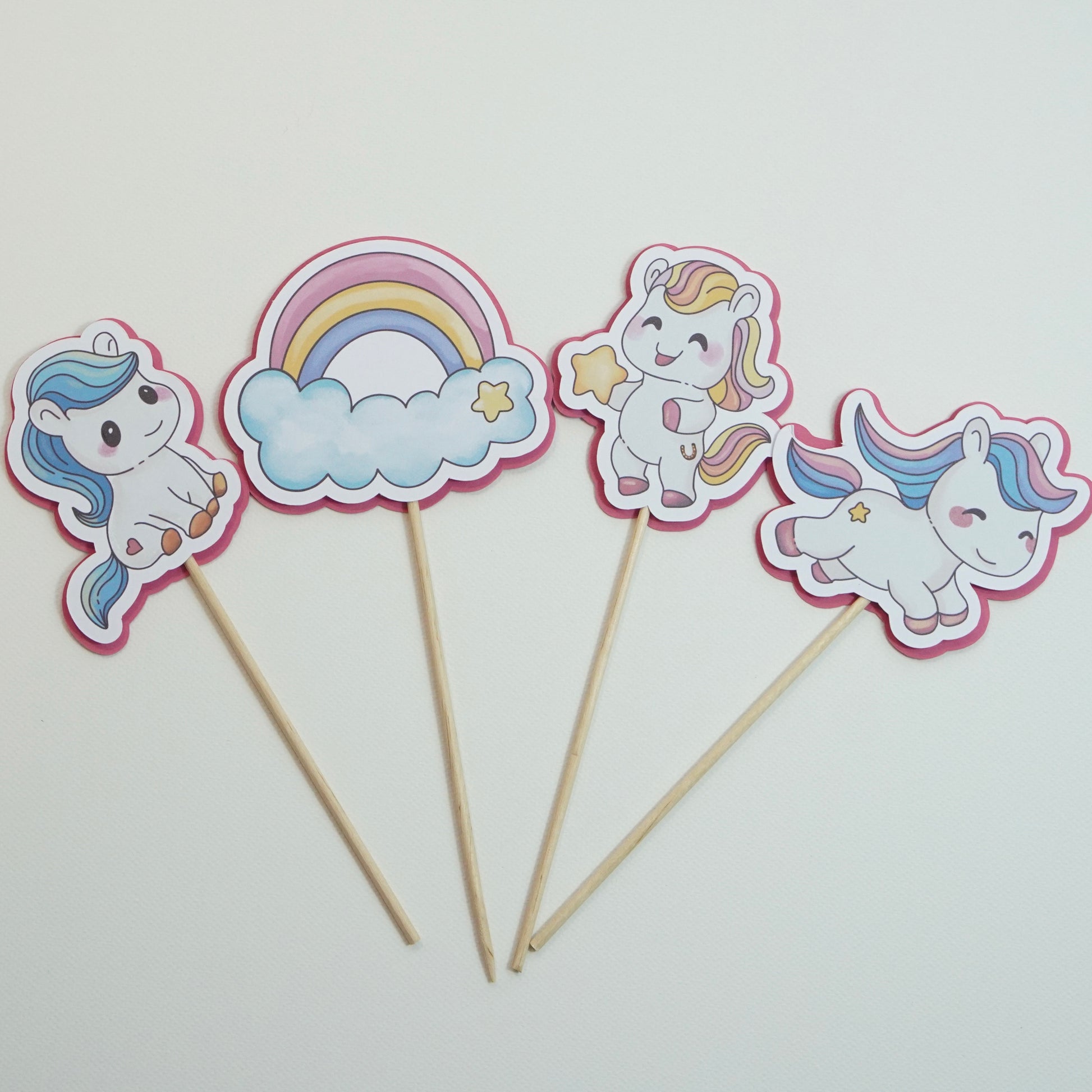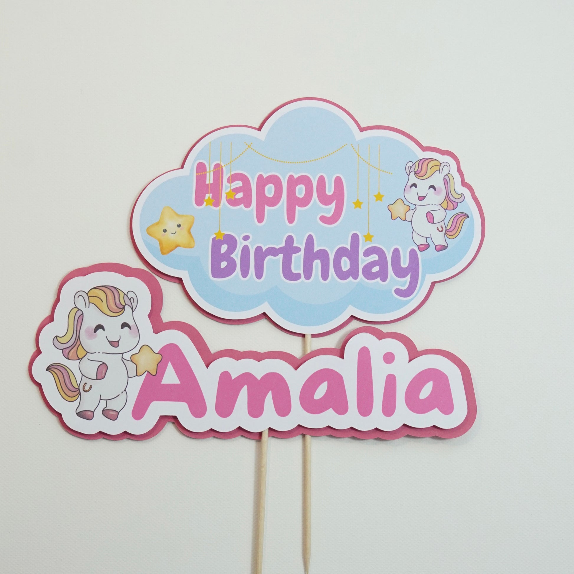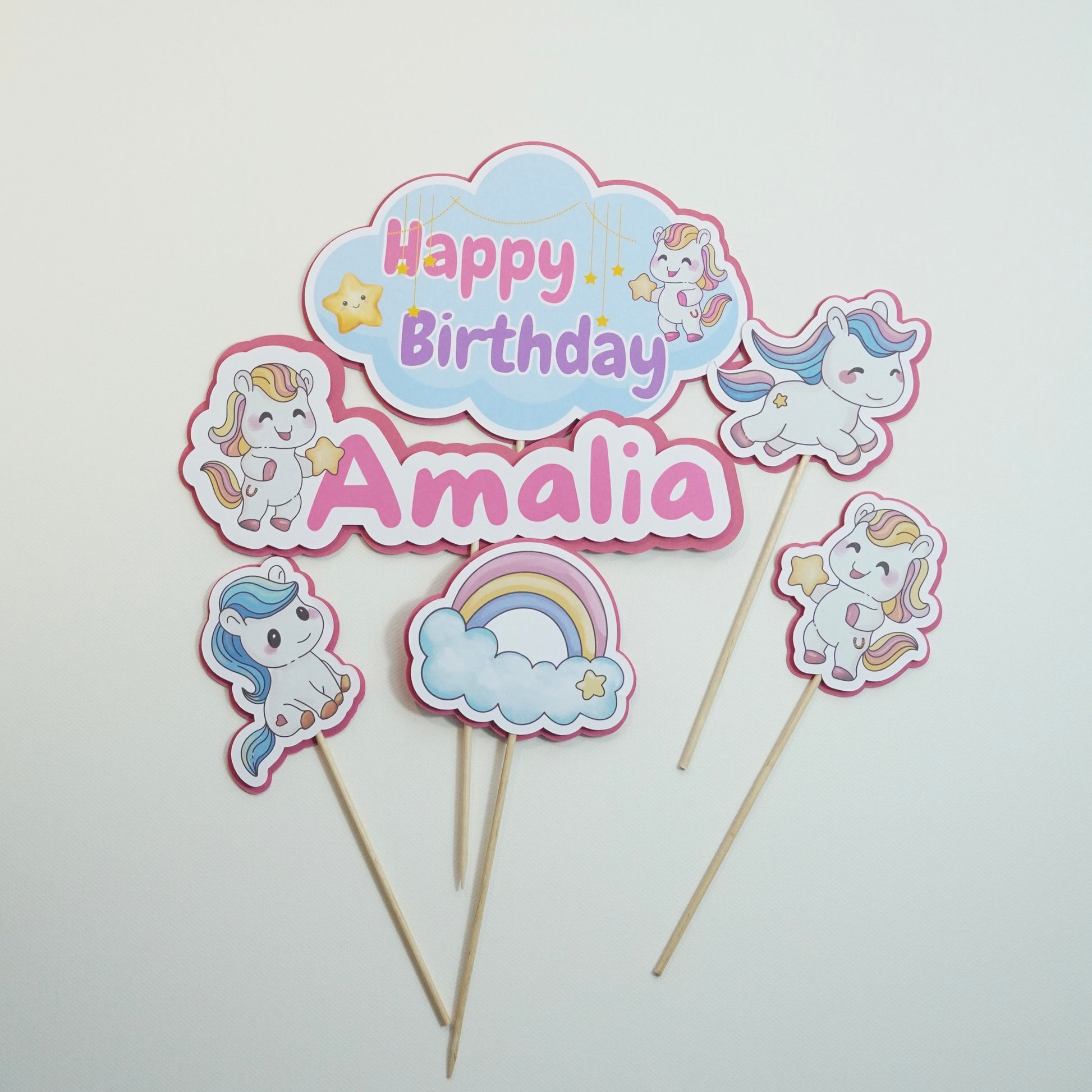 Jedes einzelne Element habe ich selbst im Kawaii-Stil illustriert und anschließend aus hochwertigem Papier gefertigt – perfekt für kleine und große Pferdefans, die sich eine fröhliche und liebevolle Geburtstagsdeko wünschen.