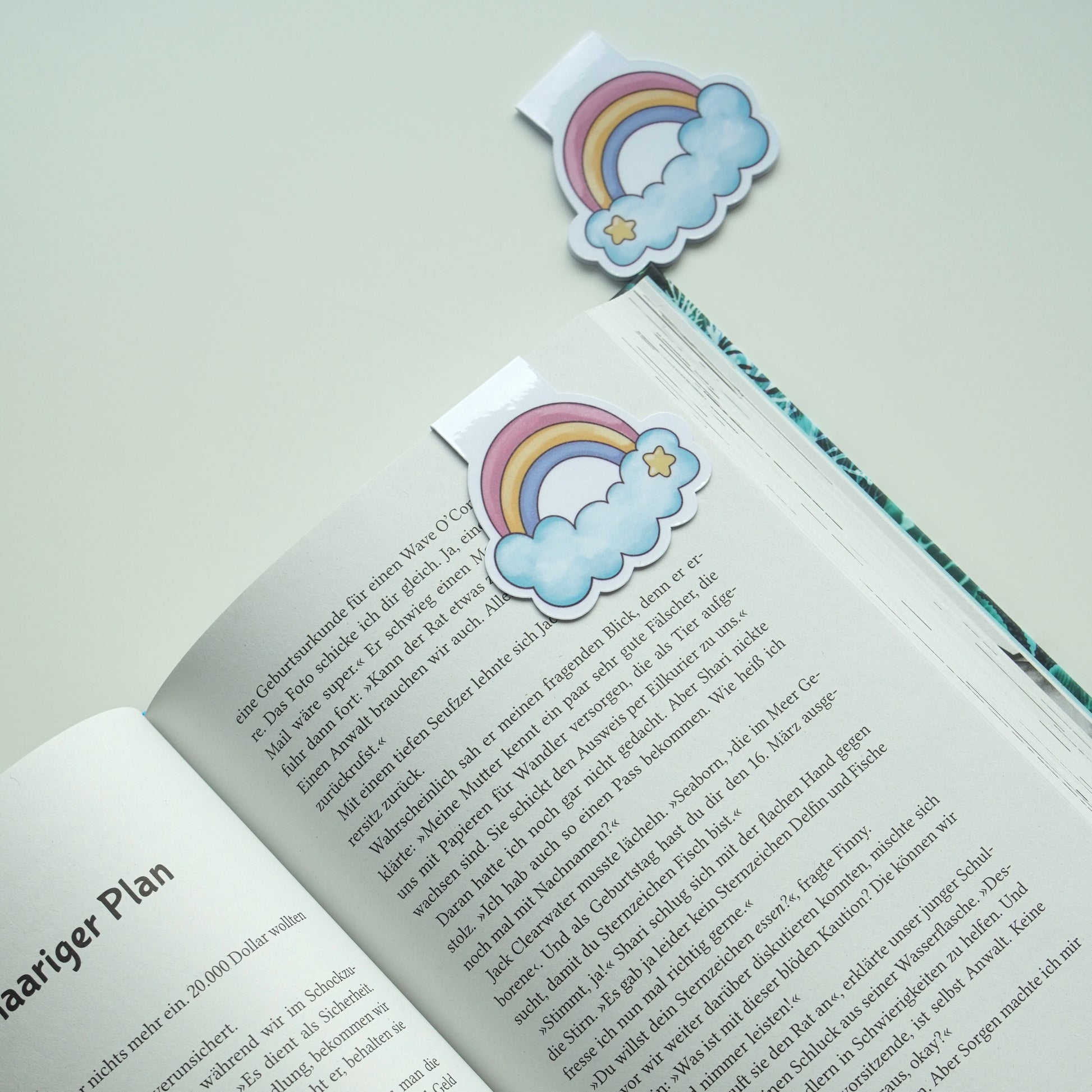 „Regenbogen auf Wolke“ 🌈☁️ begeistert mit handgezeichnetem Kawaii-Design in sanften Pastellfarben und sicherem Halt dank Magnetfunktion. Ein liebevolles Geschenk für alle, die Bücher und niedliche Motive lieben.